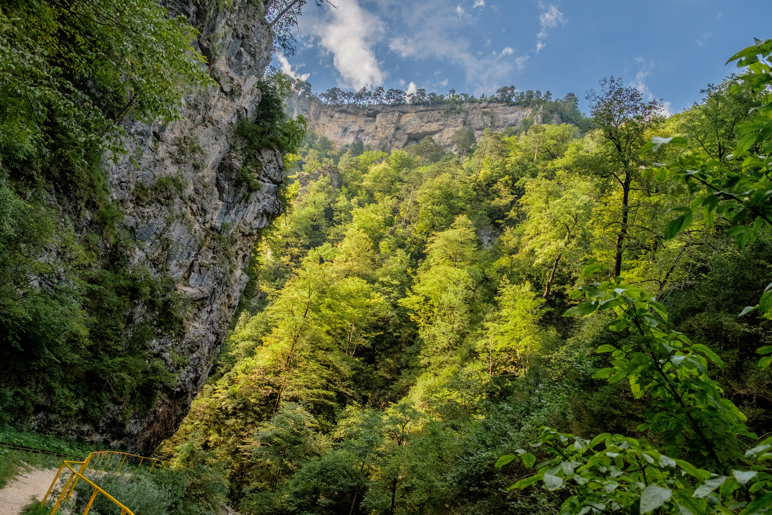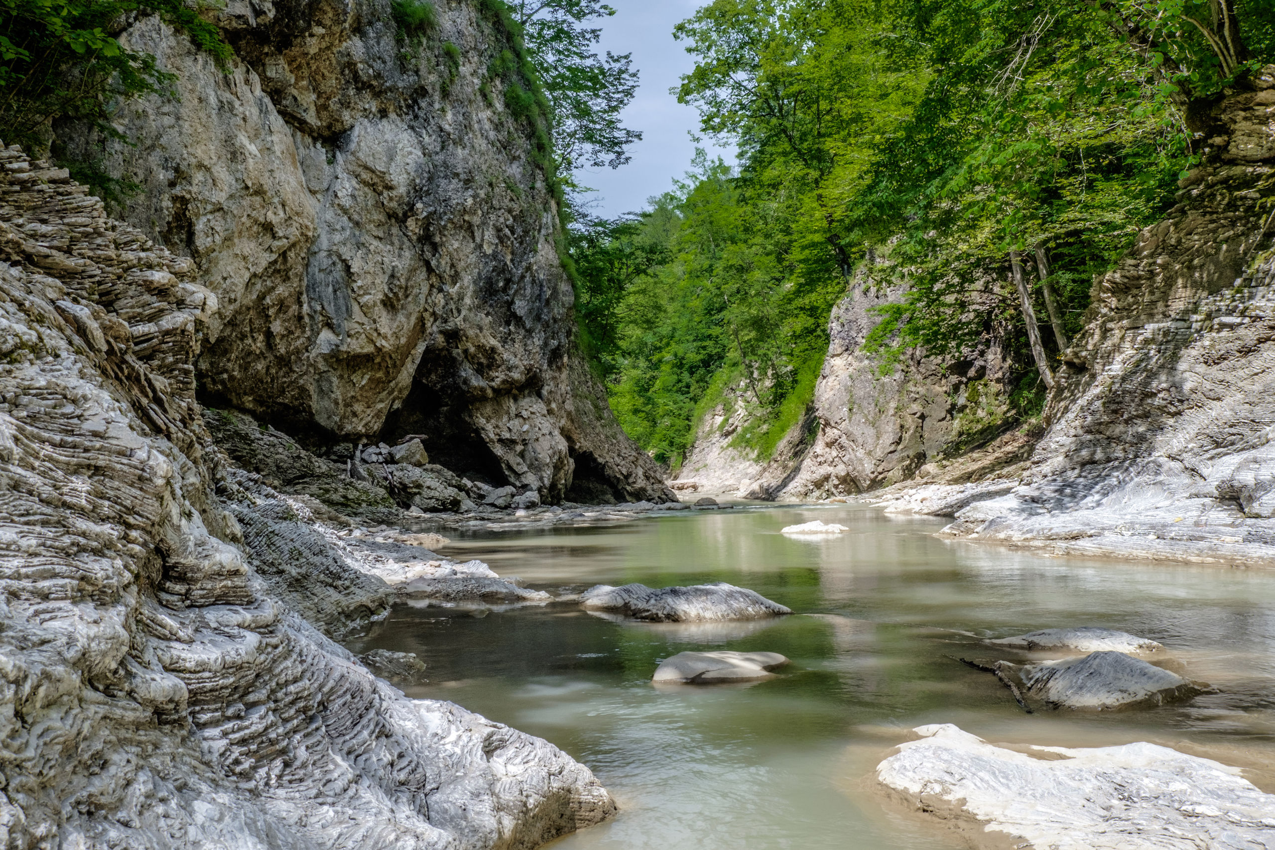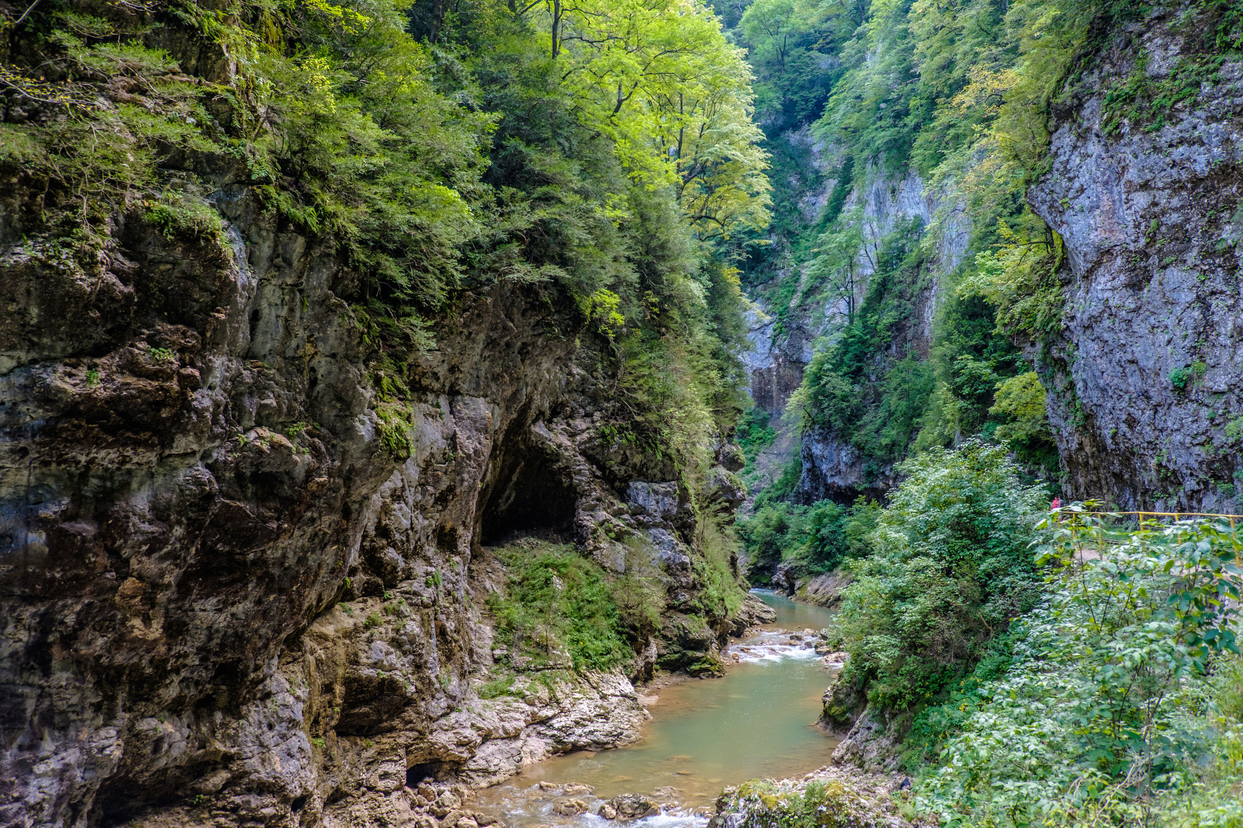 Но главное в этом труднопроизносимом поселке это Хаджохская теснина (Каменномостский каньон) — участок ущелья реки Белой