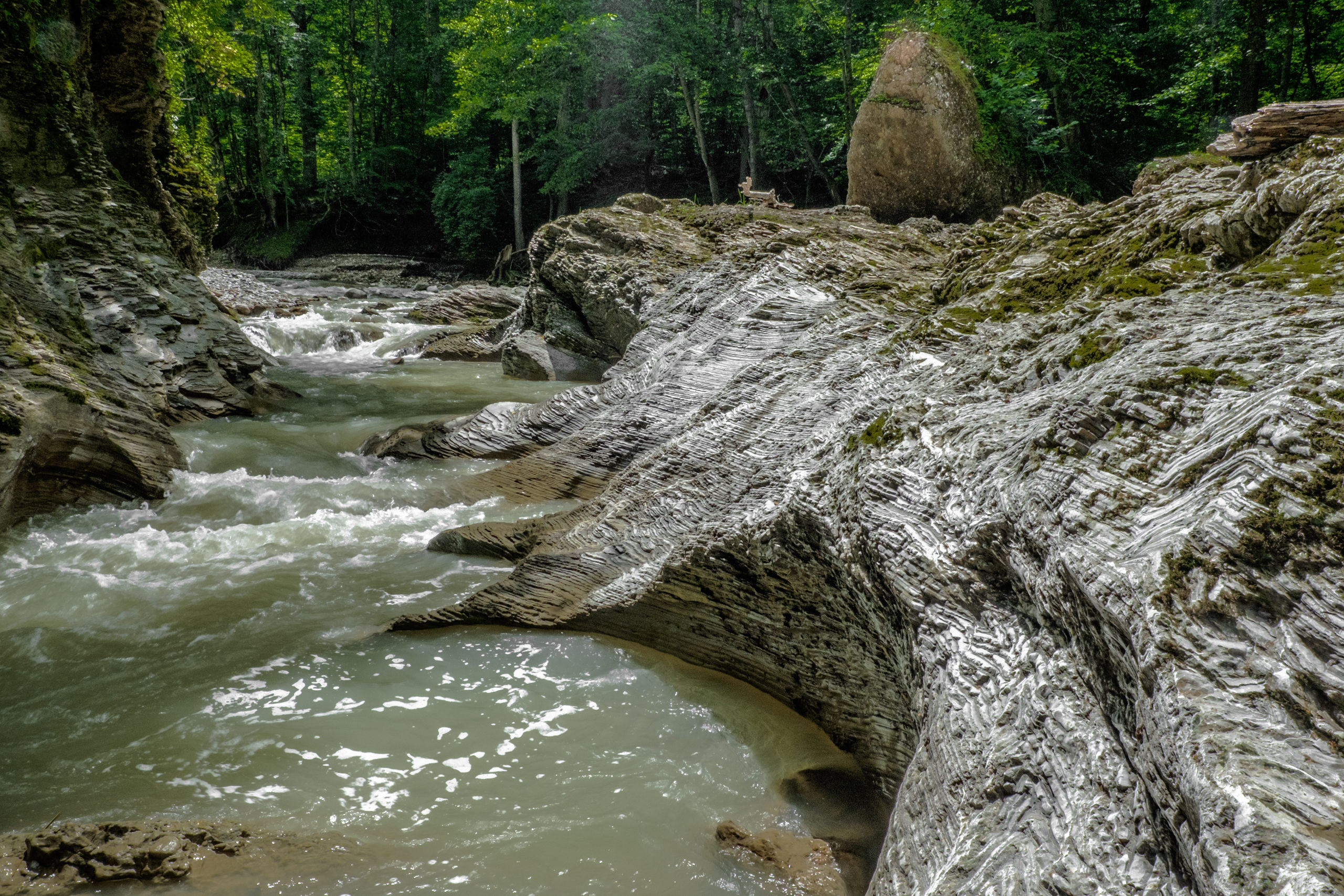 Далее по дороге в Гузерипль можно наблюдать красиво прорубившую себе дорогу среди скал реку Белая