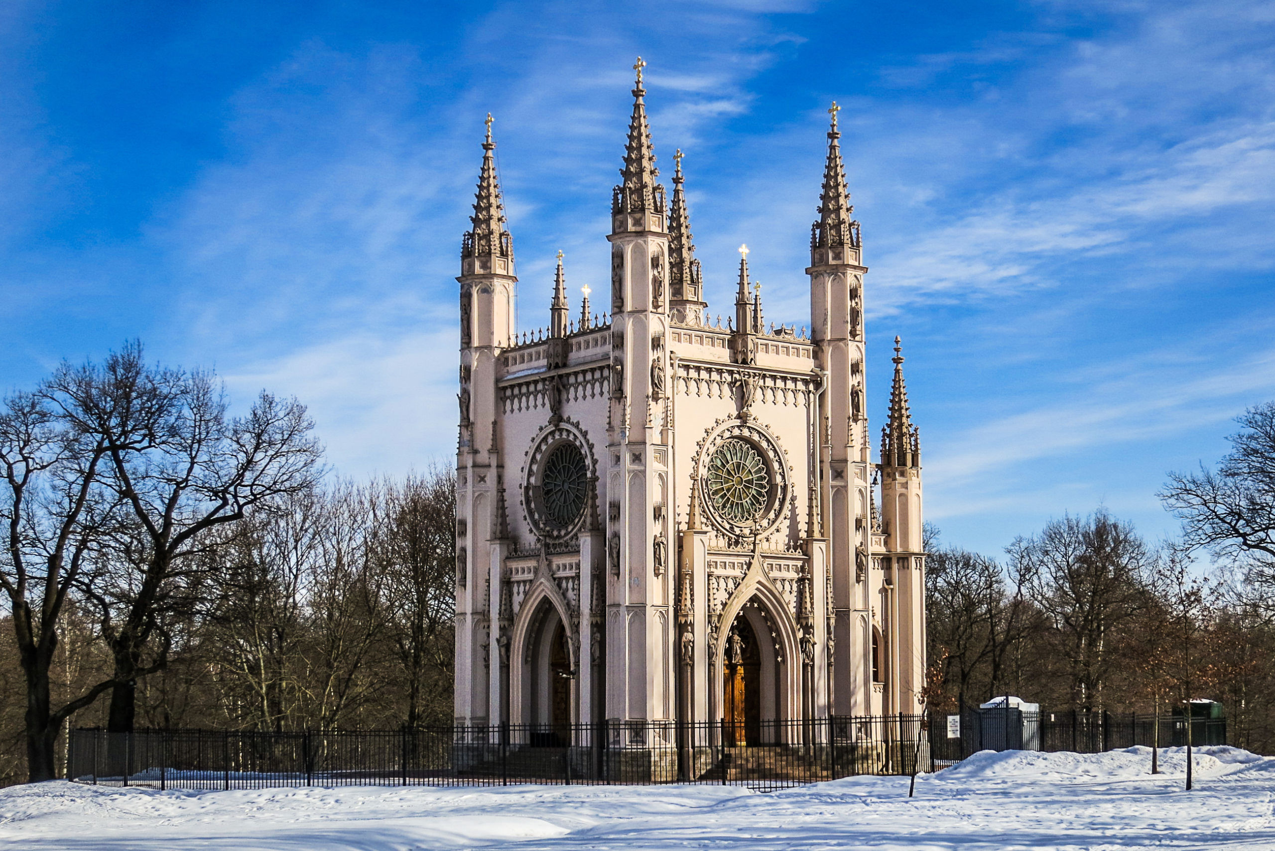 Например, буквально в 20 минутах ходьбы от Фонтана Самсона, в парке Александрия находится совершенно неоготическая «Капелла». Но это она в народе именуется Капеллой, а на самом деле это Церковь святого Александра Невского (ныне не действует). Заложена в 1831 г. по распоряжению Николая I и являлась домовой церковью императорской семьи .