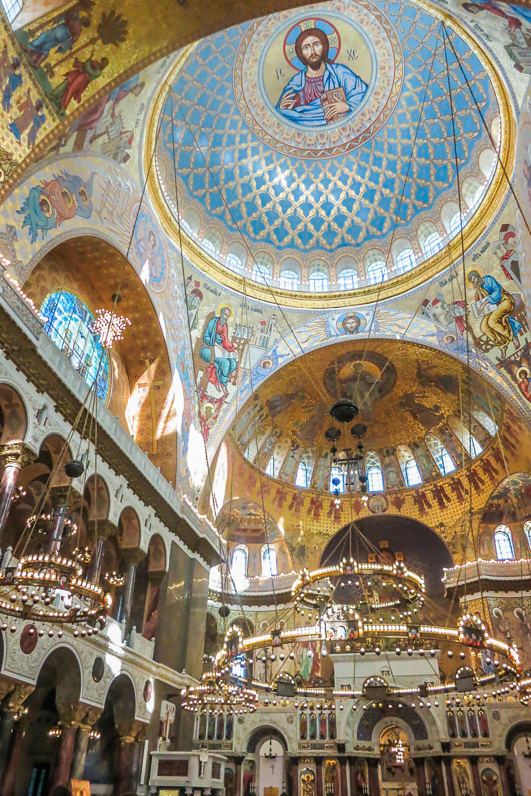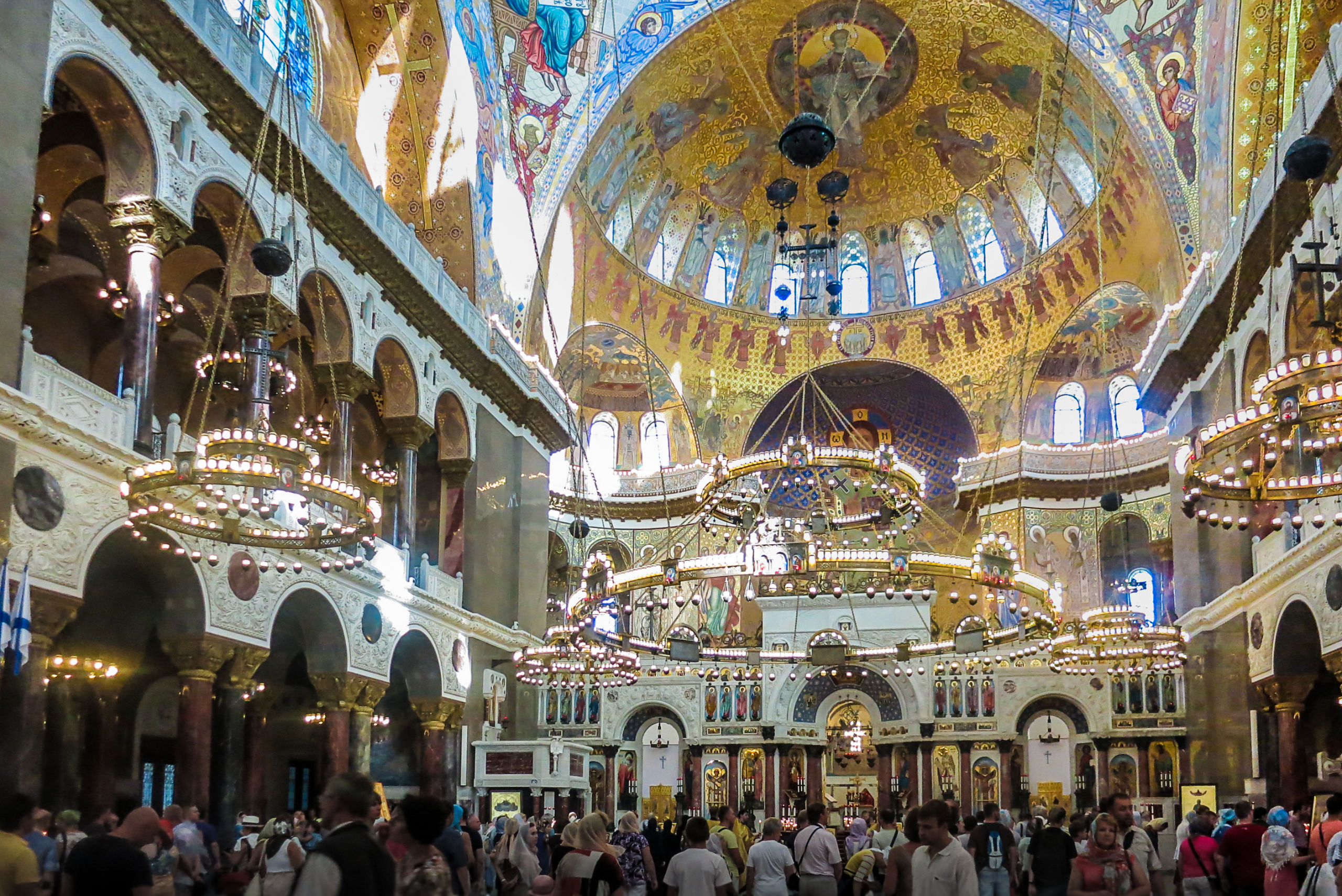Морская тематика во всем, начиная со светильников на «якорных» цепях и заканчивая полом, устланным мозаичными фигурами рыб, медуз и прочих морских жителей (как реальных, так и мифологических), изображениями морских растений и кораблей. Очень, согласитесь, необычно для православного храма.